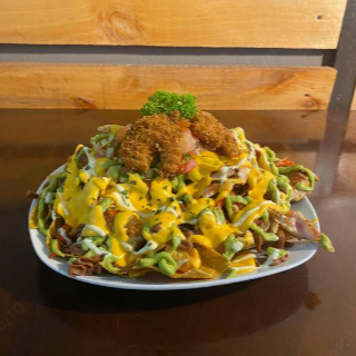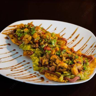 Tortillitas fritas de maíz, frijoles molidos, salsas de la casa, salsa de queso, guacamole, pico de gallo, trocitos de pollo y 3 camarones al panko (empanizados).