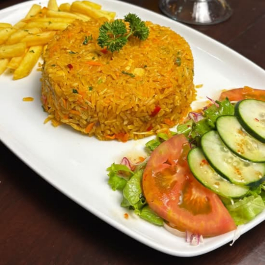 2 deliciosos arroz con pollo acompañados de papas fritas y ensalada.