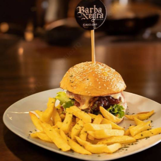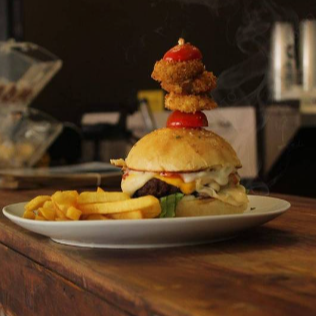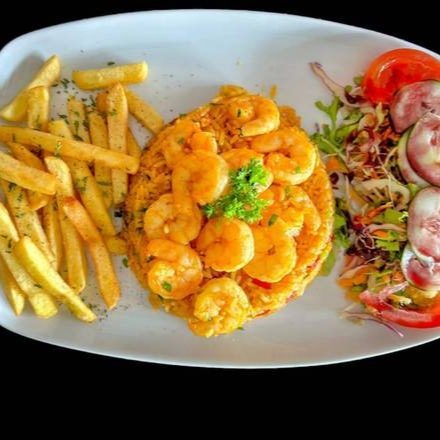 Pan artesanal, torta 1/2 libra, salsa tártara, queso americano, queso mozzarella, tomate, cebolla, pepinillos, lechuga, salsas de la casa y camarones al panko (empanizados). Acompañada de papas fritas.