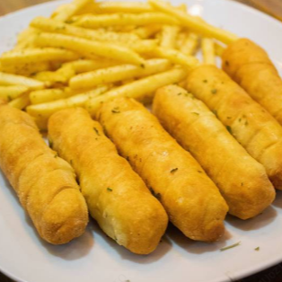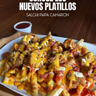 600 g de papas salchichas, 8 camarones empanizados y deliciosas salsas de la casa.