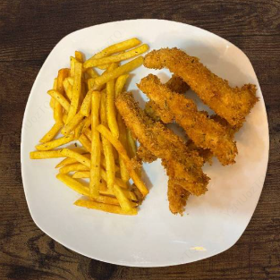 Con papas fritas. Deditos de pescado.