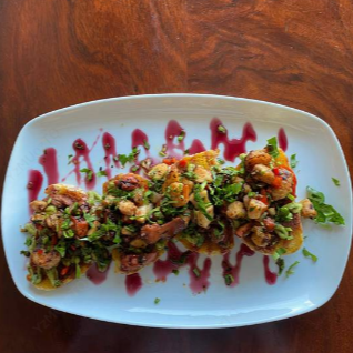 2 deliciosos mini nachos, tortillitas de maíz, frijoles molidos, guacamole, pollo, queso mozzarella y camarones empanizados con salsas de la casa.