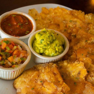 Con patacones y salsas de la casa.