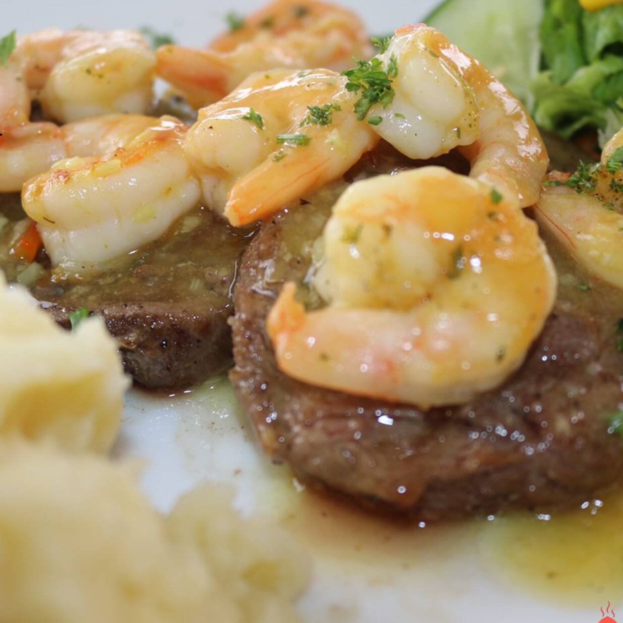 200gr de Lomito en Medallones con Camarones al ajillo + 2 acompañamientos a elegir.