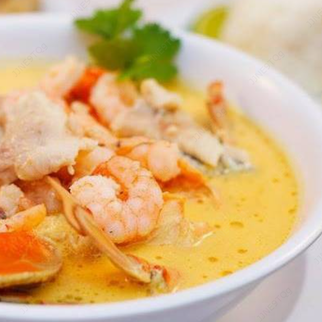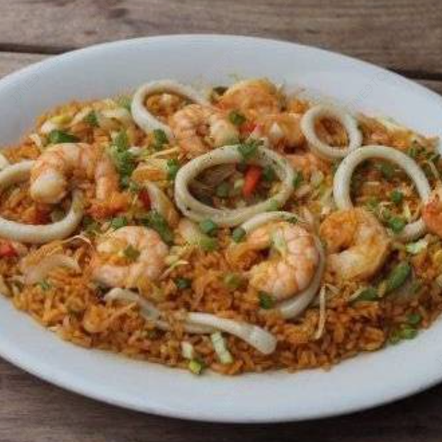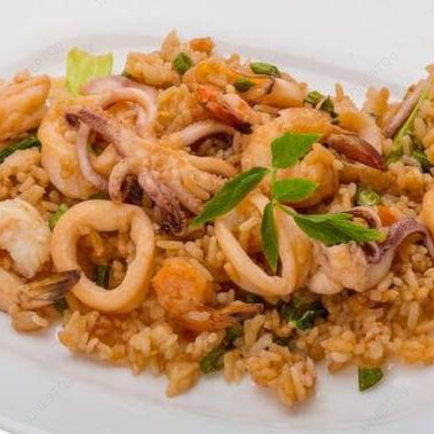 Una variedad de jugosos mariscos seleccionados para ser degustados en su mesa, acompañada con arroz blanco. Mariscos frescos y seleccionados (pulpo, calamar, camarón vino blanco sabor artificial no contiene alcohol).