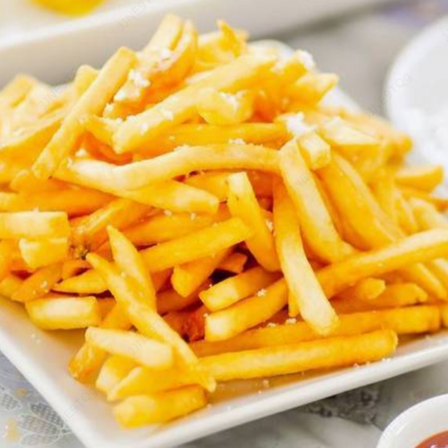 Papas a la francesa de corte fino, doradas y crujientes.