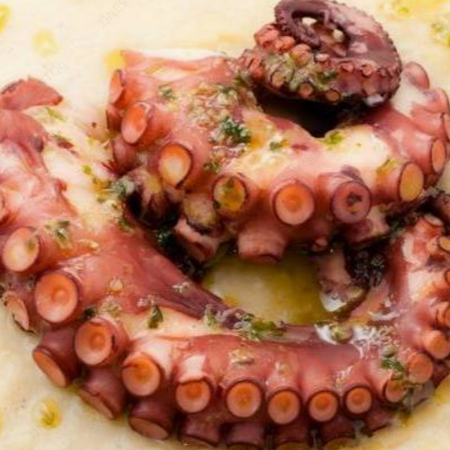 Delicioso pulpo salteado en mantequilla y ajo, acompañado de puré y vegetales.