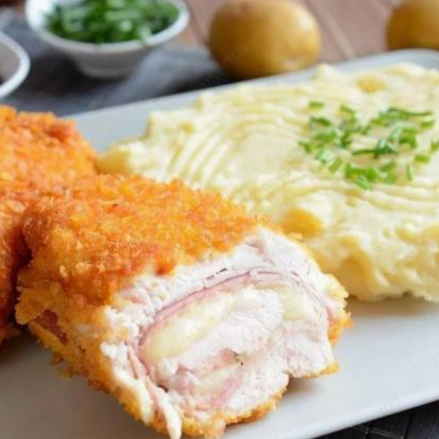 Suculento filet de pescado, relleno de jamón y queso, bañado con una deliciosa salsa de hongos, puré, arroz y vegetales.