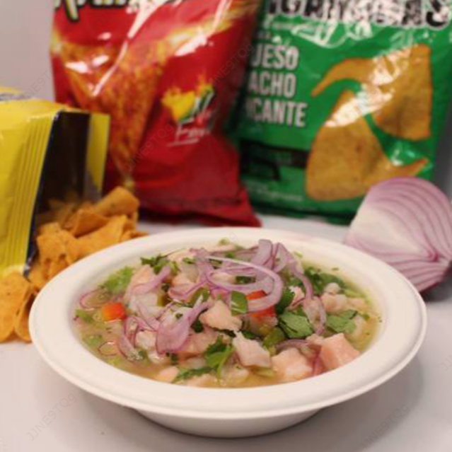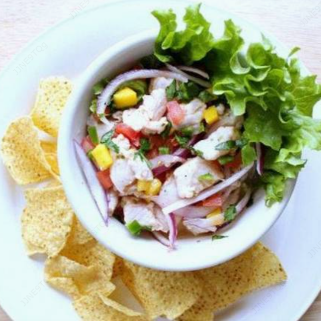 Delicioso ceviche de pescado en cubos marinado en cítricos. Porción grande.