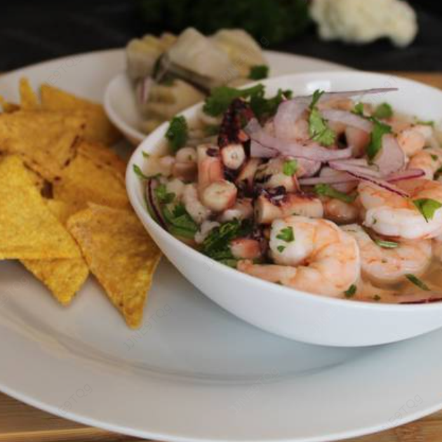 Porción grande de ceviche de camarón, marinado en limón y servido en su jugo cítrico.