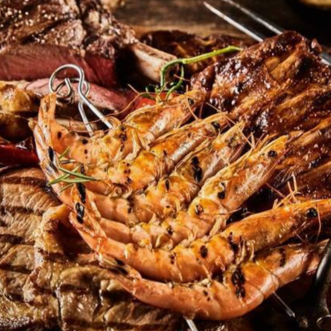 250 g Lomito de res a la plancha, rodeado de camarones al ajillo, papa asada y vegetales salteados.