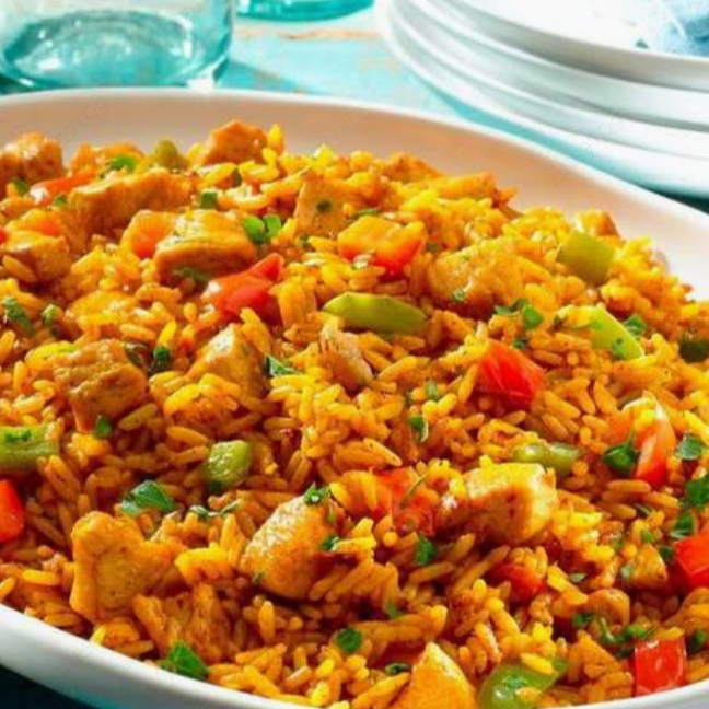 Delicioso arroz con trocitos de pollo, chile dulce y vegetales.
