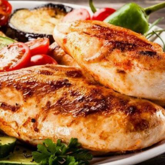 Jugosa pechuga de pollo a la plancha, puré y vegetales.