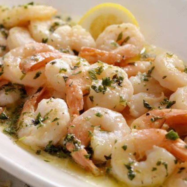 6 Deliciosos camarones jumbo con o sin cáscara, al ajillo acompañado de puré y vegetales.