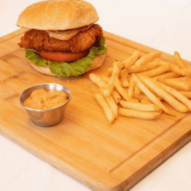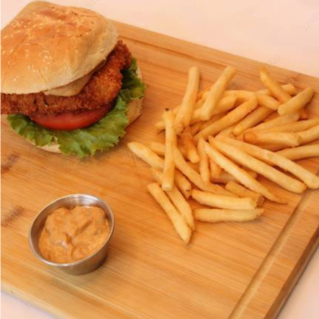 Deliciosa hamburguesa de filet de dorado fresco empanizado con nuestro crujiente panko japonés y aderezado con cualquiera de nuestras salsas de la casa. Acompañado de papas.