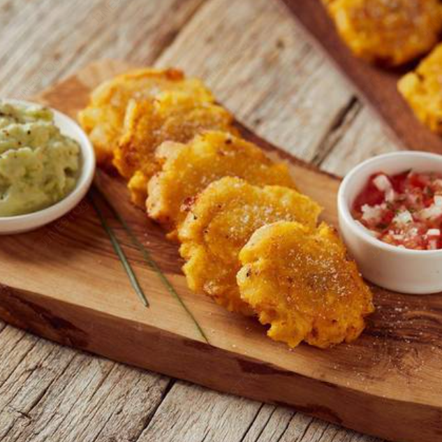 5 Deliciosos patacones acompañados con frijoles molidos y pico de gallo.