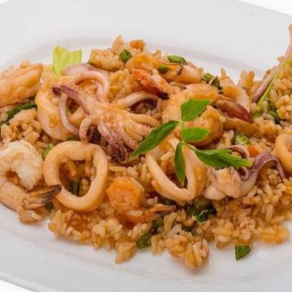 Una variedad de jugosos mariscos seleccionados para ser degustados en su mesa, acompañada con arroz blanco. Mariscos frescos y seleccionados (pulpo, calamar, camaron vino blanco sabor artificial no contiene alcohol).