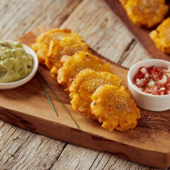 4 Crujientes patacones con frijoles molidos, pico de gallo, guacamole y camarones al ajillo o empanizados.