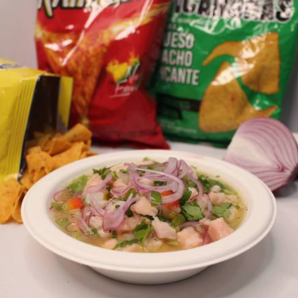 Delicioso ceviche de pescado en cubos marinado en cítricos. Porción grande.