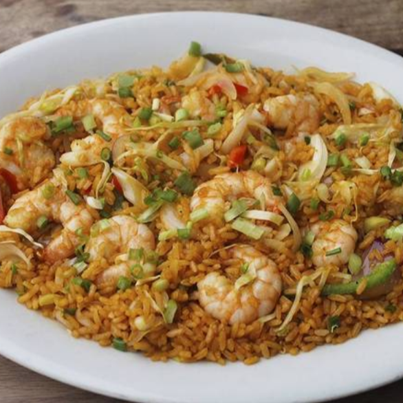 Arroz sazonado con camarones, vegetales picados y toque de culantro.