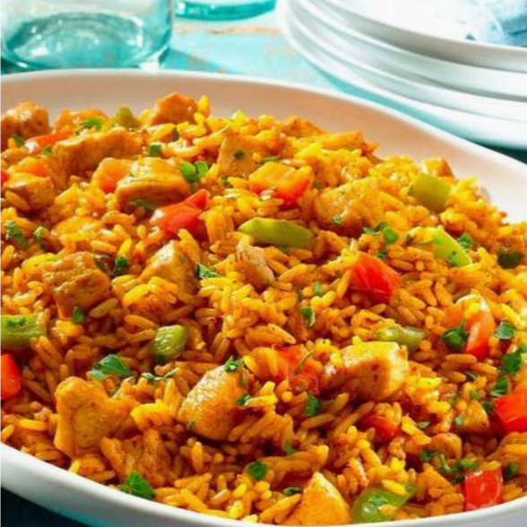 Delicioso arroz con trocitos de pollo, chile dulce y vegetales.