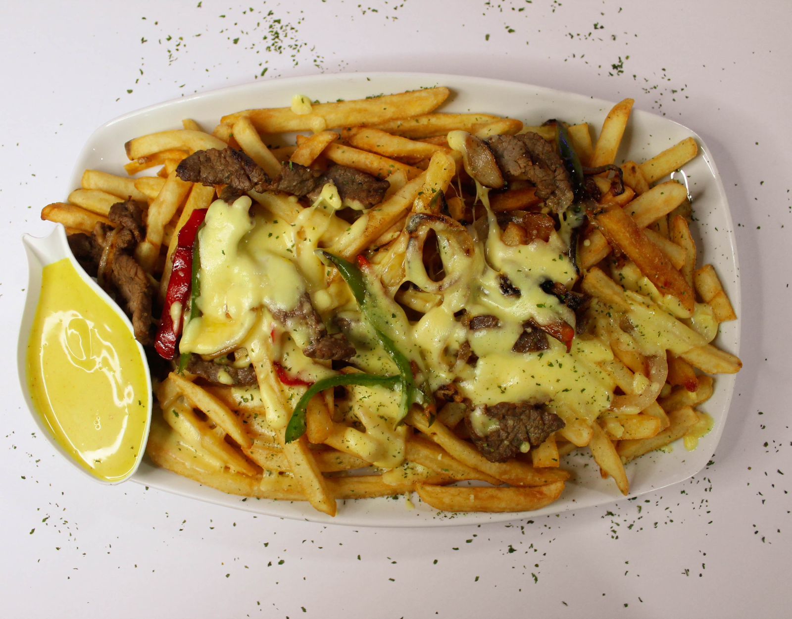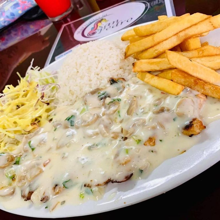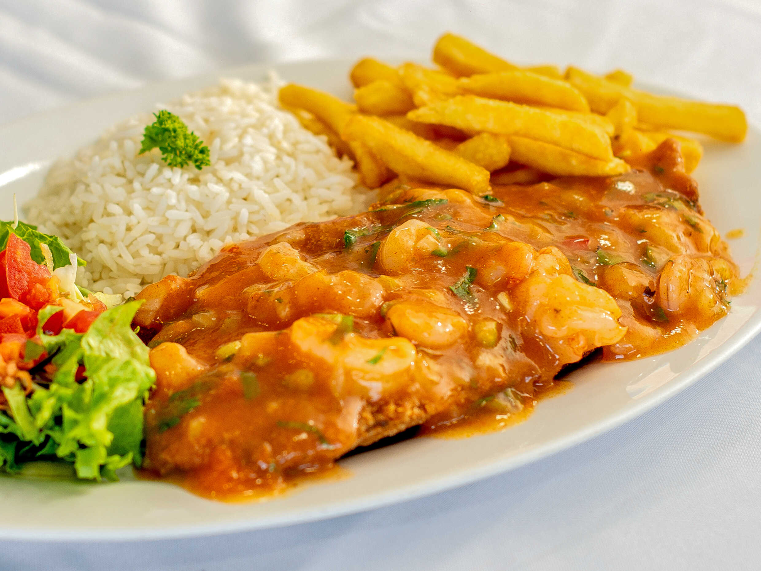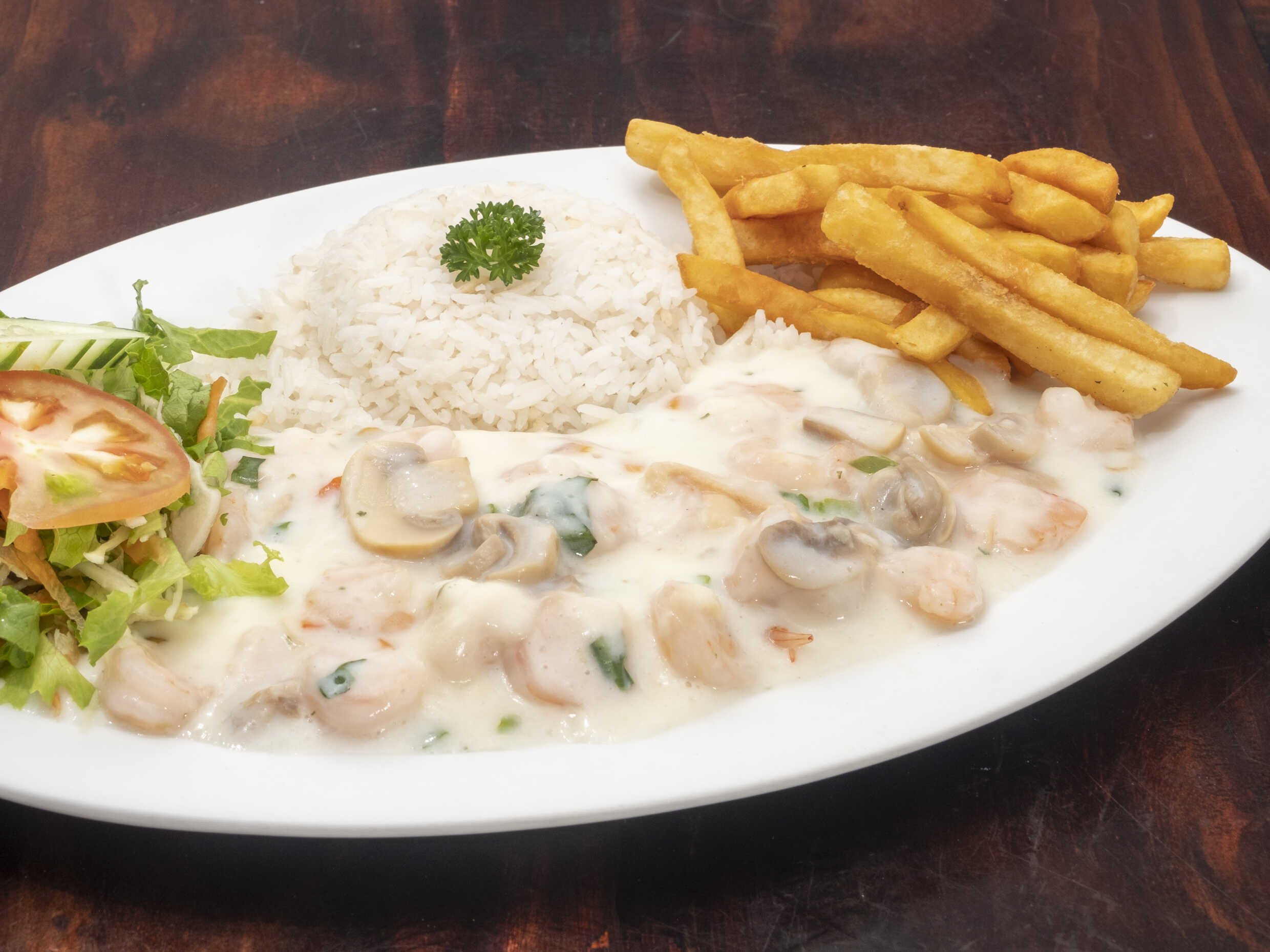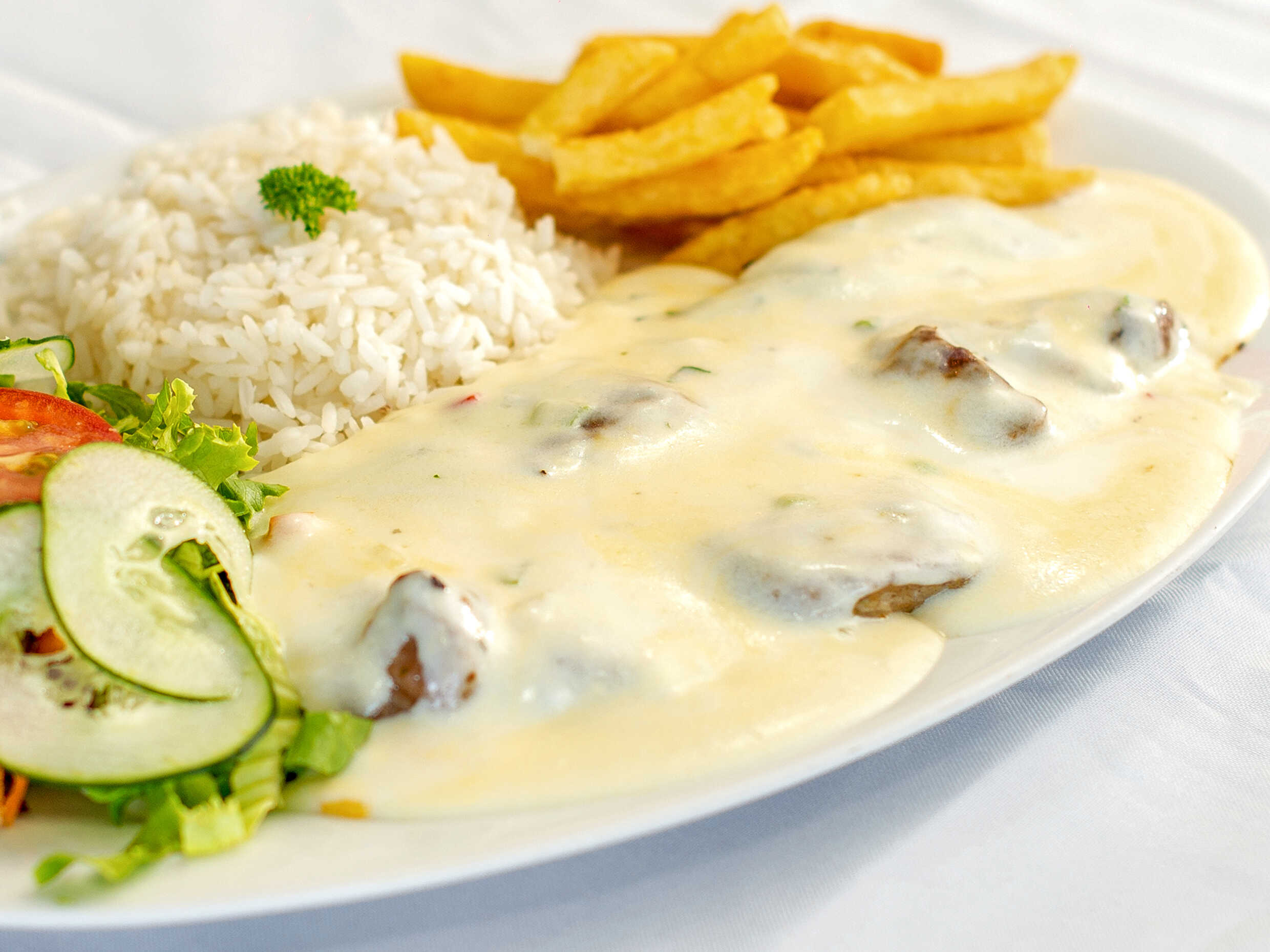 Lomito bañado en salsa blanca con queso mozzarella, acompañado de arroz, Papas y ensalada.
