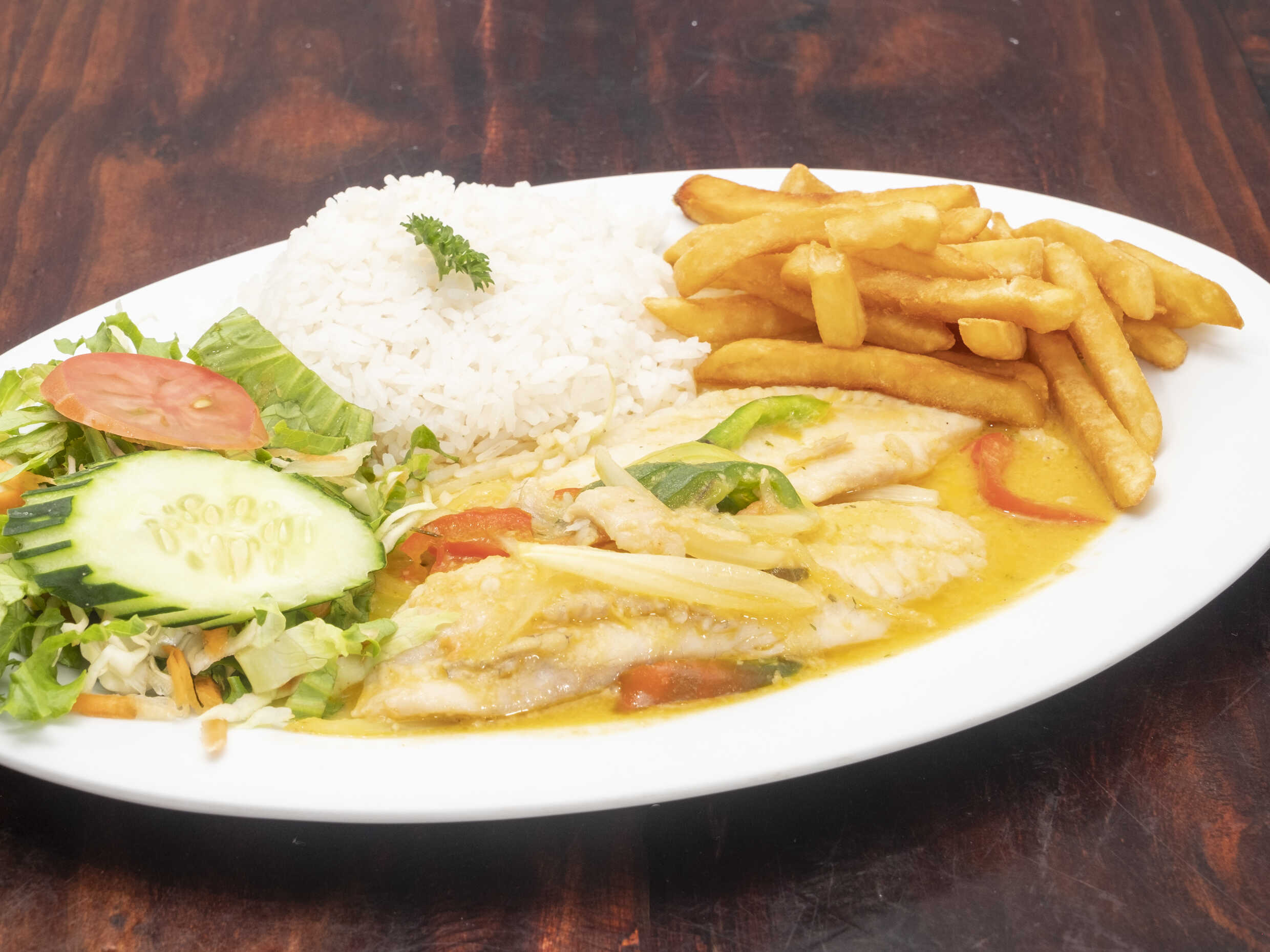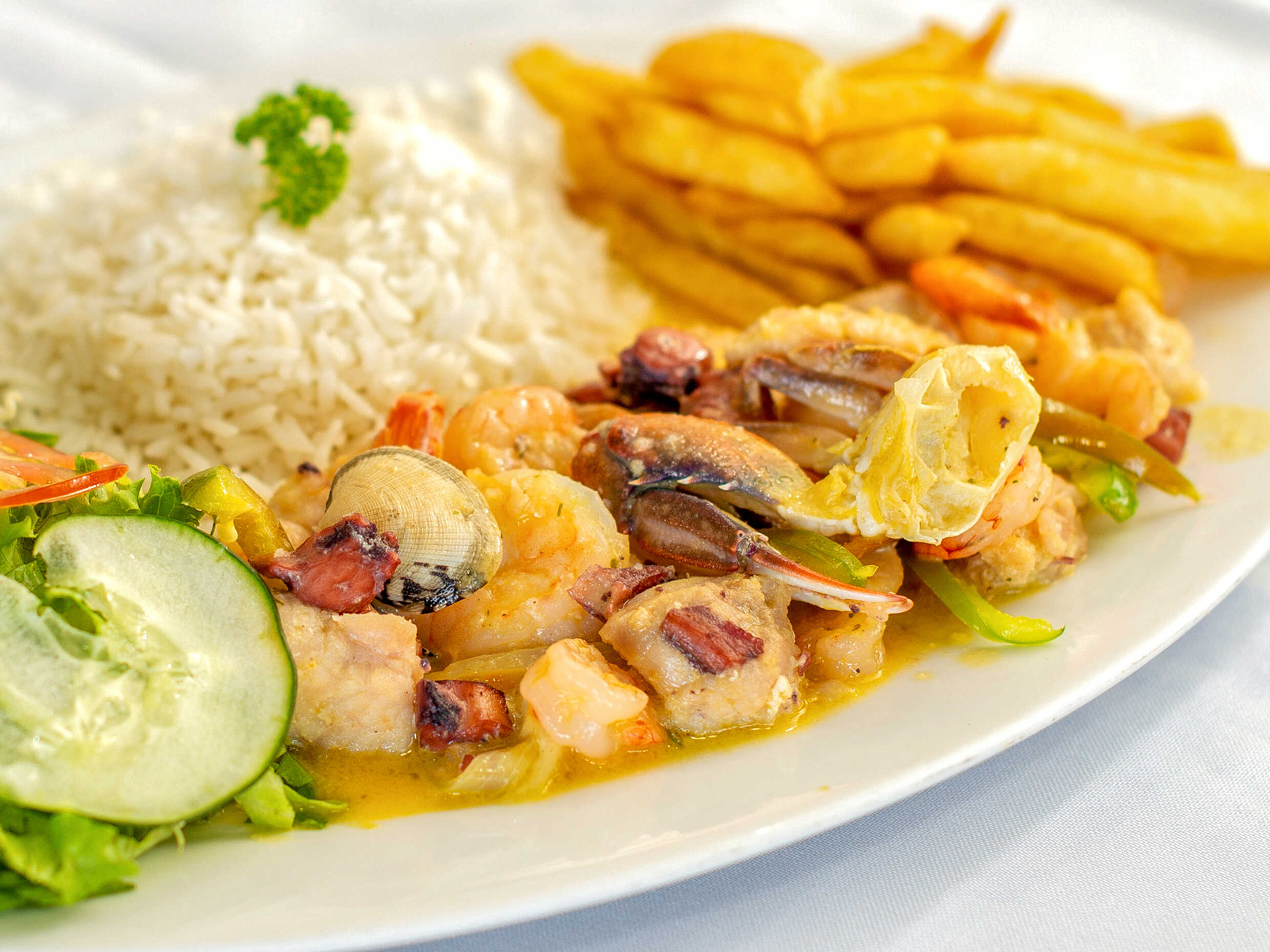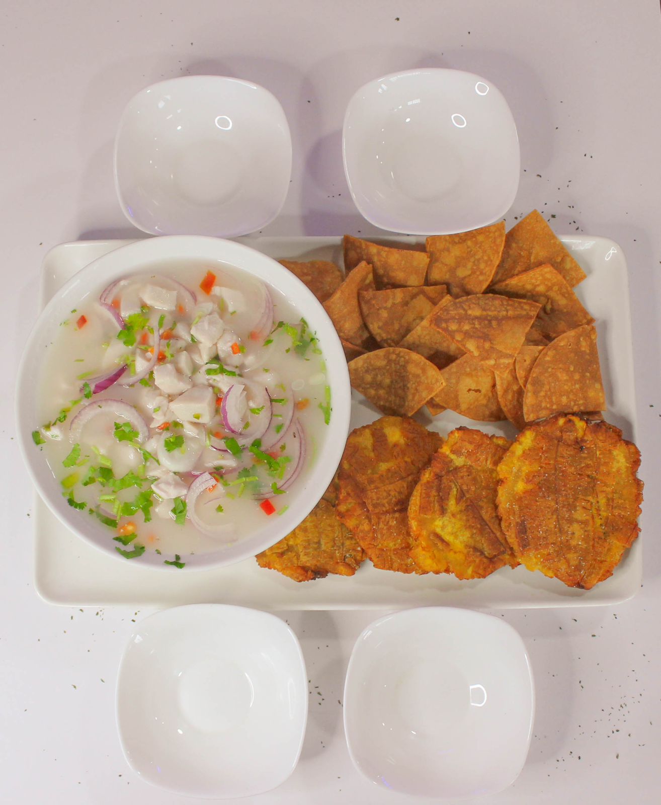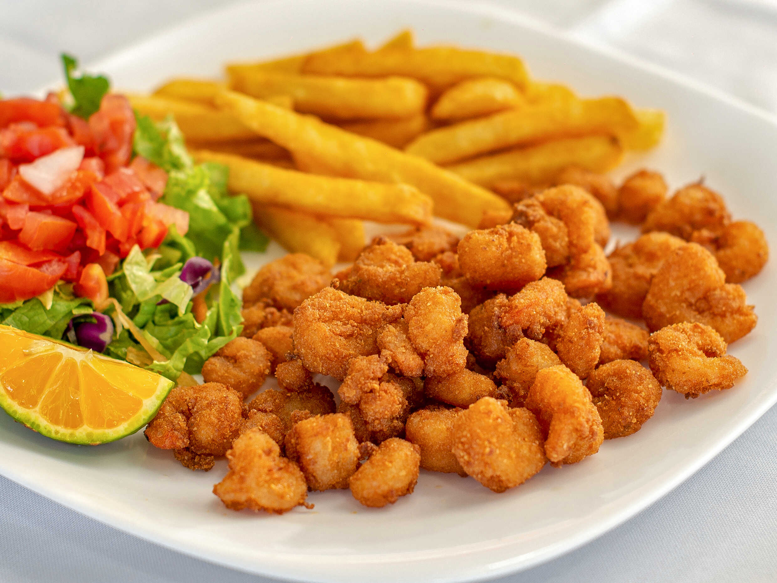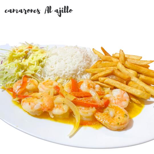 Arroz, papas fritas, ensalada, lechuga con aderezo o chimichurri, o de repollo con aderezo mostaza miel o chimichurri, pescado, calamar, camarón y concha.