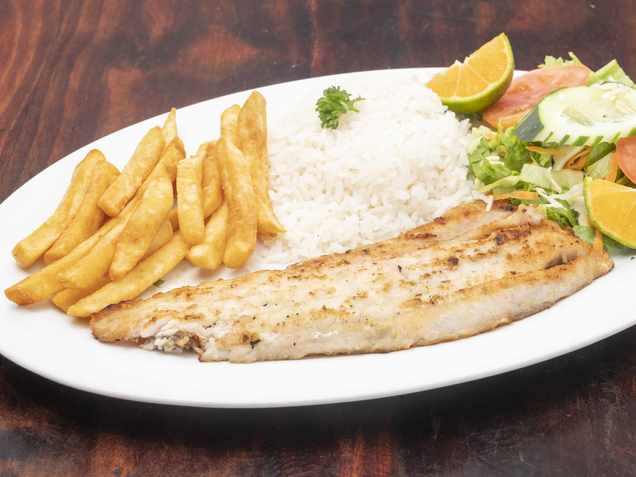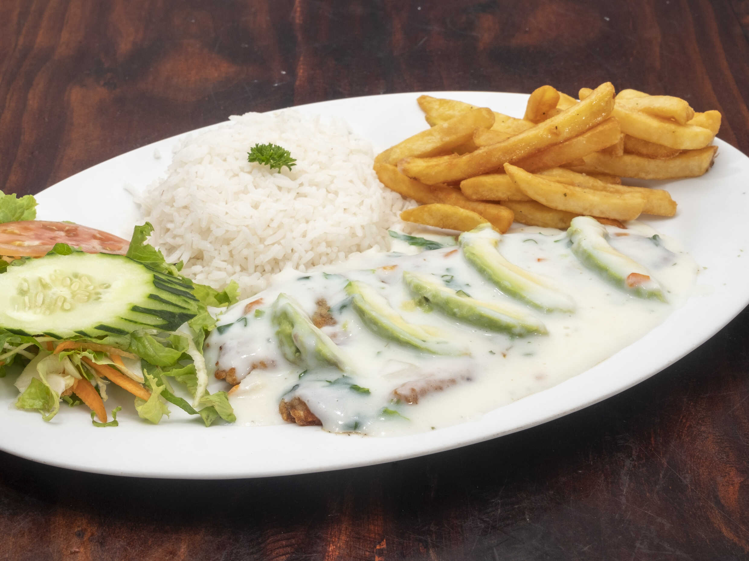 Filete a la plancha con rebanadas de aguacate y bañado en salsa blanca, acompañado de arroz, papas y ensalada.