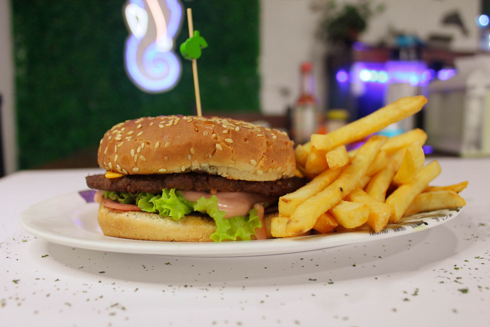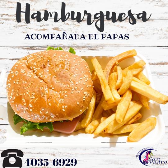 Hamburguesa con carne, jamón, queso, lechuga, tomate y salsas. Incluye papas fritas.