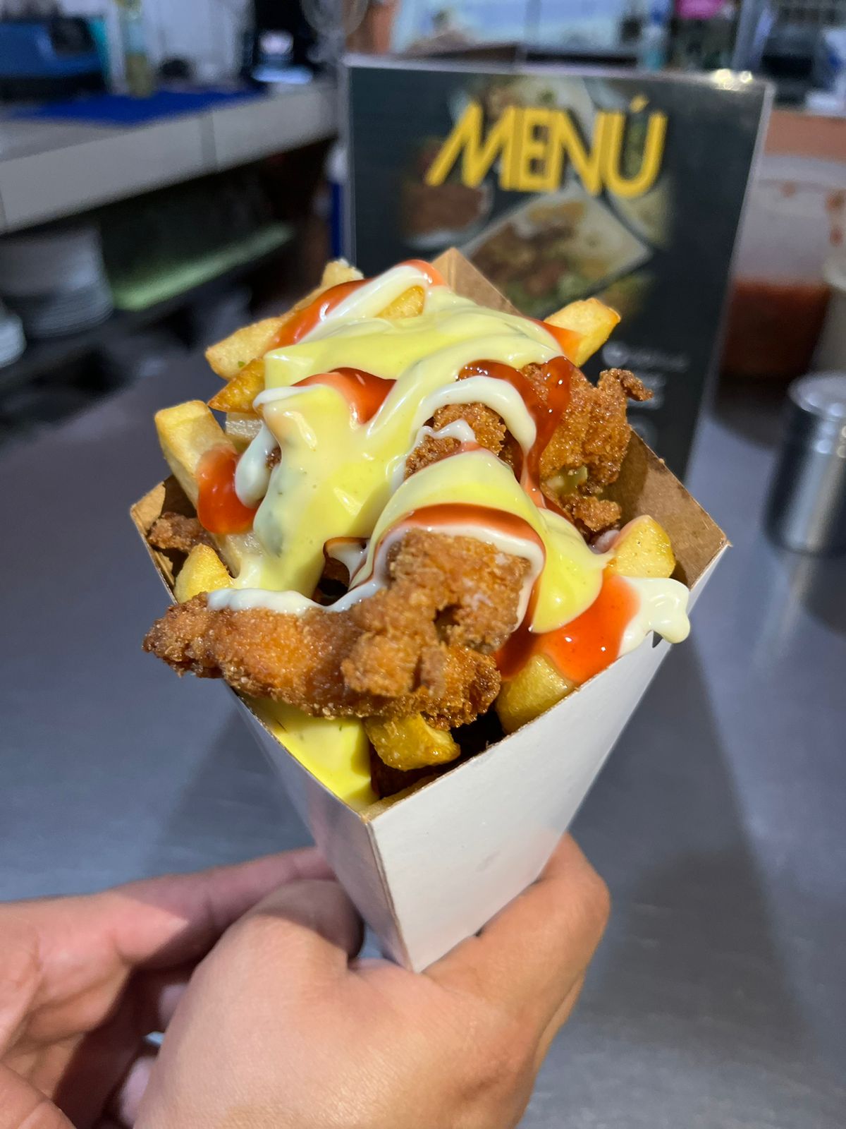 Cono con papas fritas y proteína a elegir bañadas de nuestras salsa