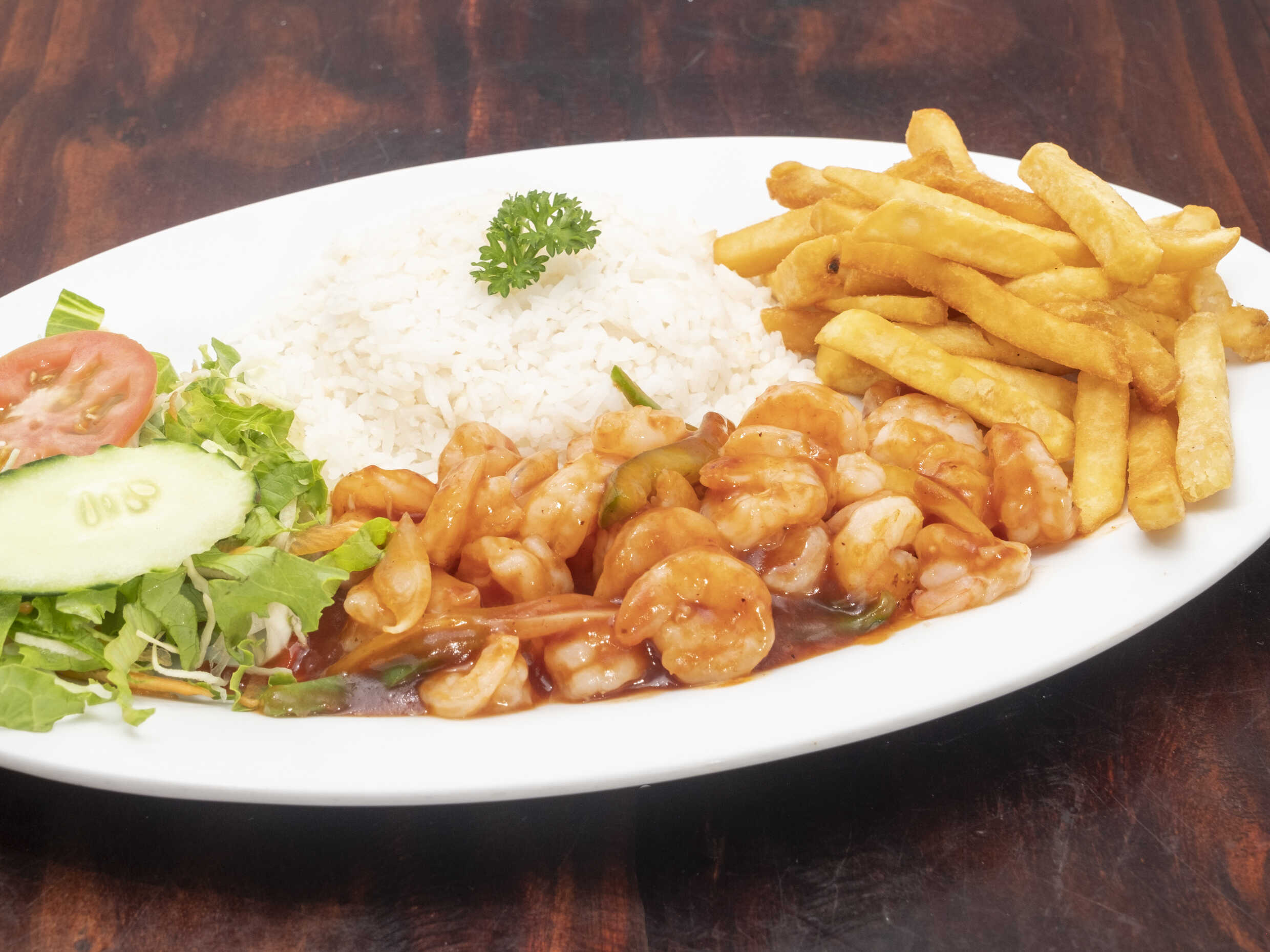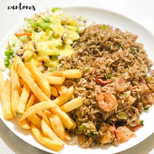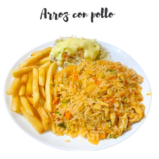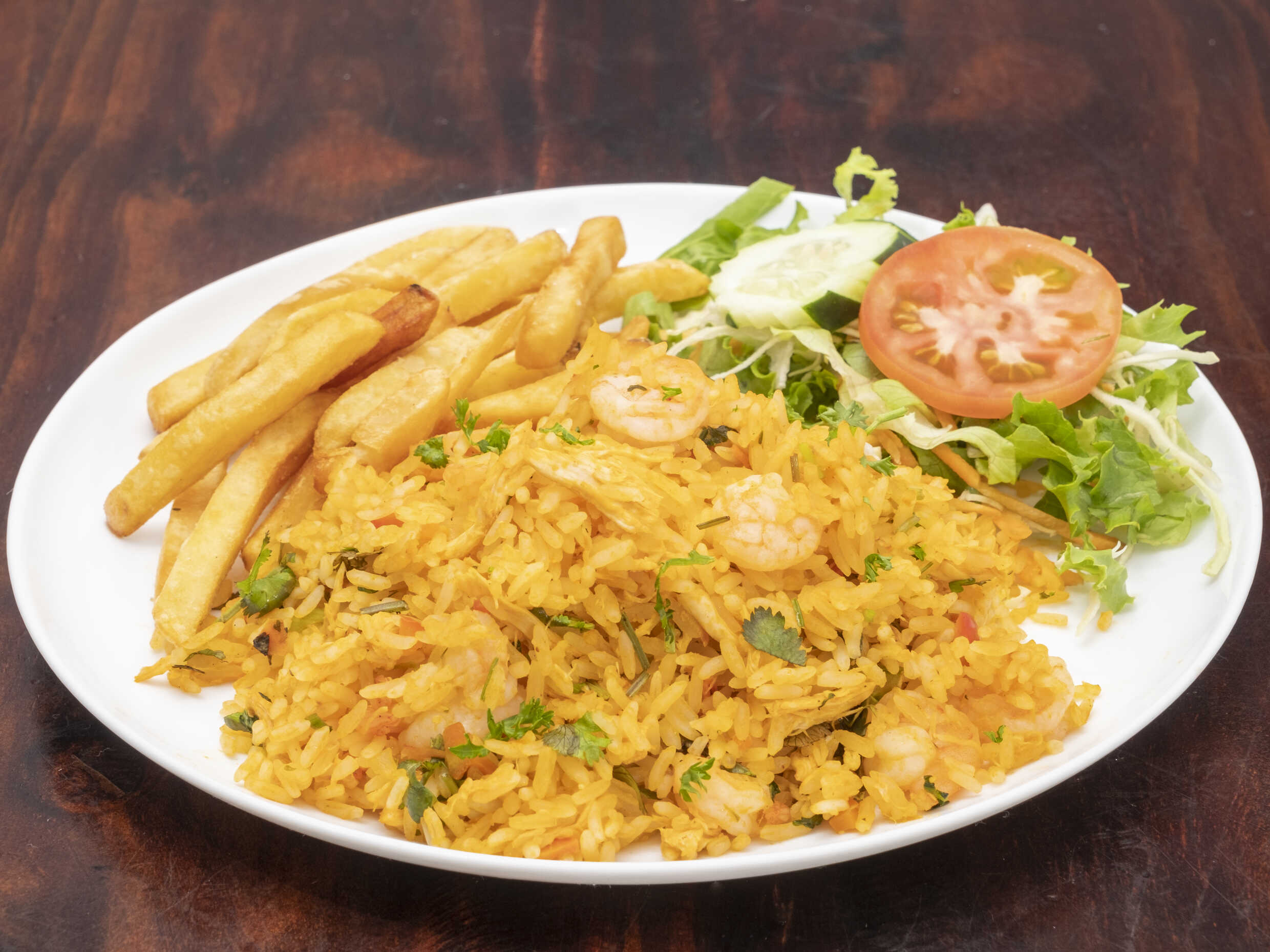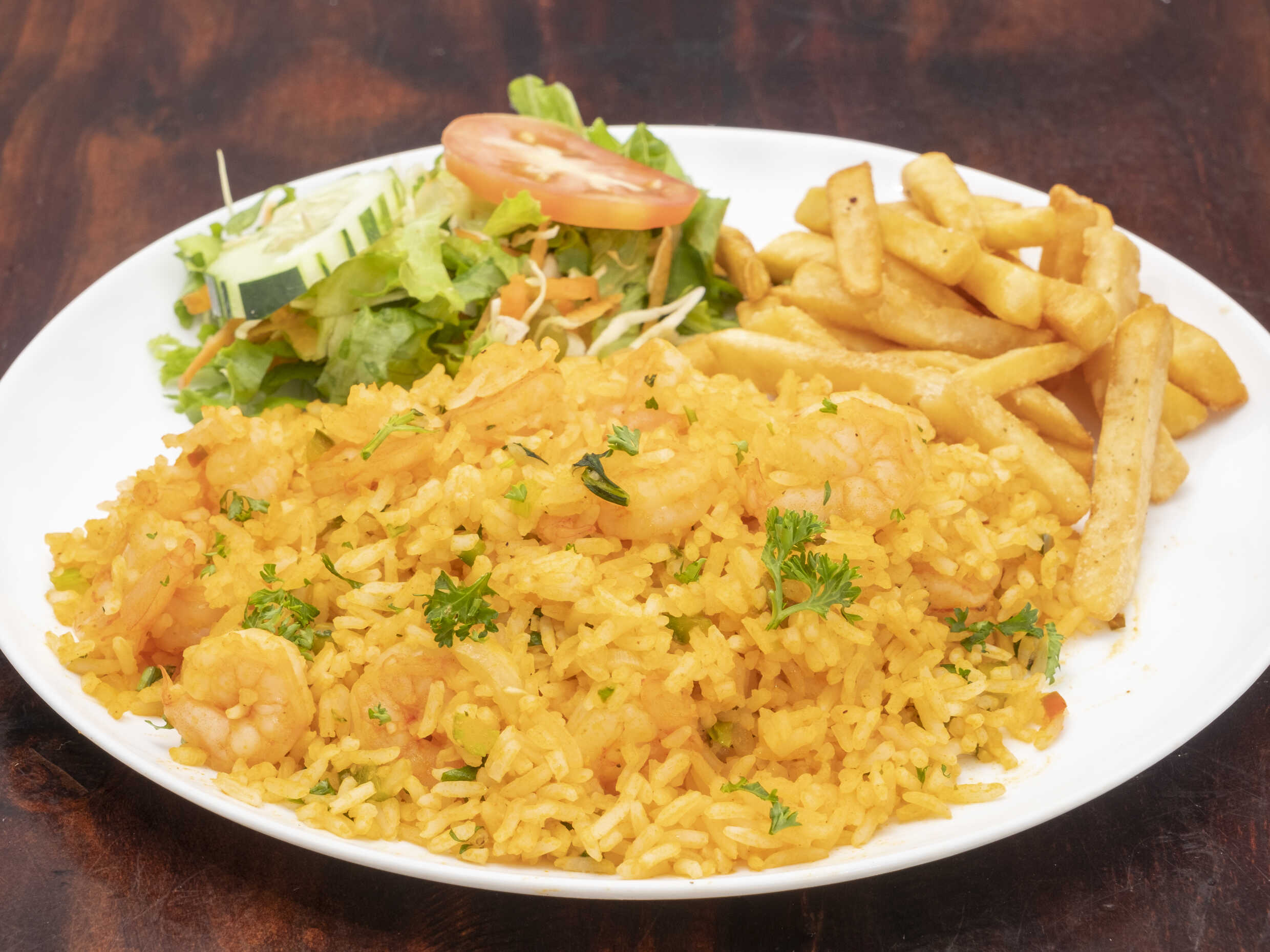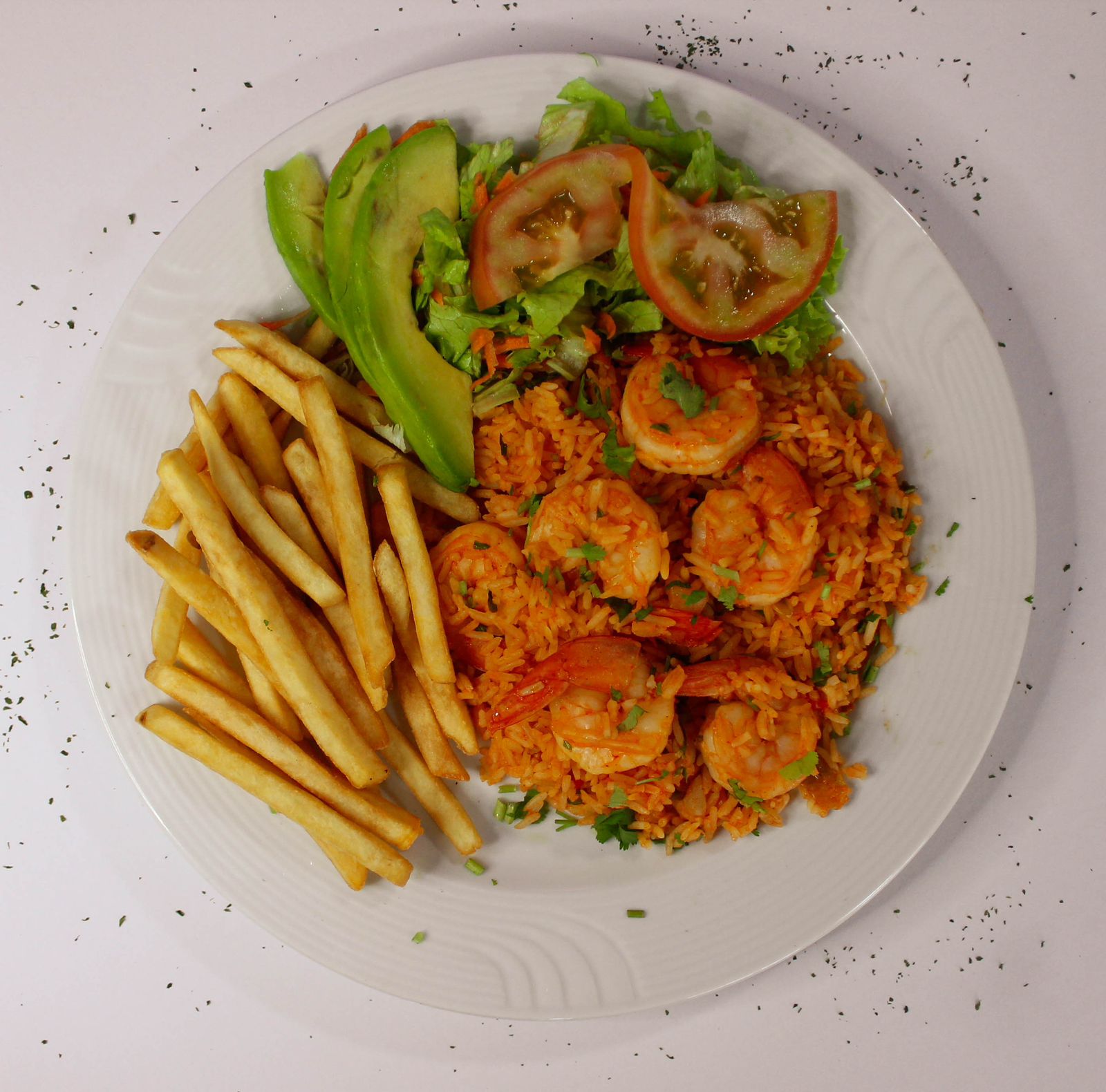 Medio arroz con camarón y pollo. Acompañado de papas y ensalada.
