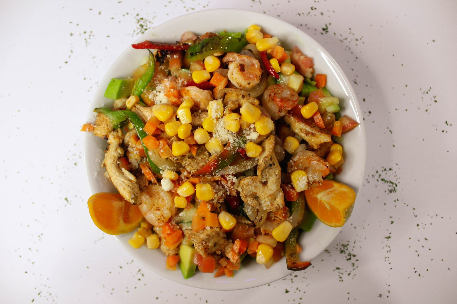 Lechuga, tomate, pepino, aguacate,crotones,maíz,zanahoria,queso parmesano con pollo y camarones a la plancha