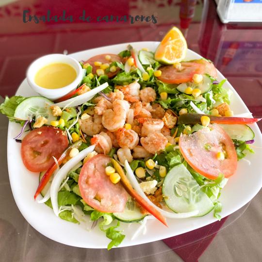 Lechuga, tomate, pepino, pan, cebolla, chile, maíz, camarones a la plancha con delicioso aderezo.