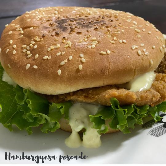 Hamburguesa con pescado empanizado con salsa tártara, lechuga, queso y tomate. Acompañado de papas fritas.