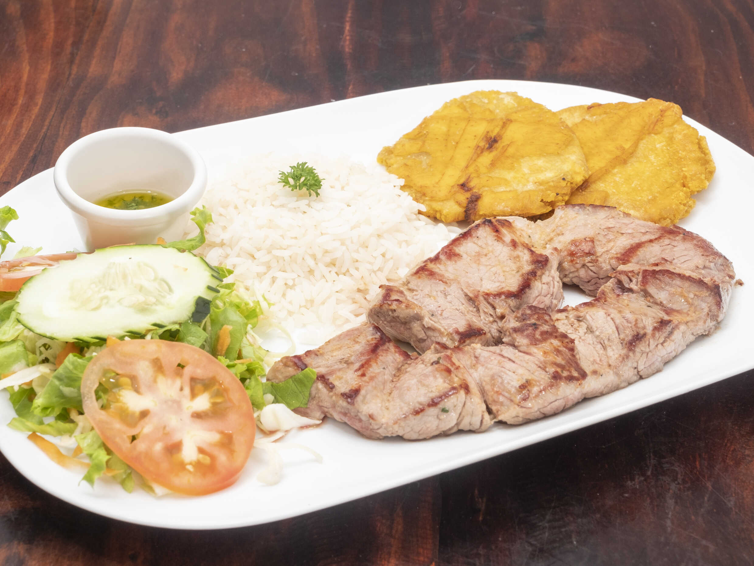 Carne a elegir, pollo, carne en salsa, pescado, bistec o chuleta con arroz, frijoles, plátanos maduros, tortillas.