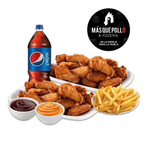 🍗16 alitas en tus 2 salsas. favoritas a escoger ( BBQ, MostazaMiel, Búfalo o MangoCoco ) 🍟Papas Medianas 🧋Pepsi 2.5 litros