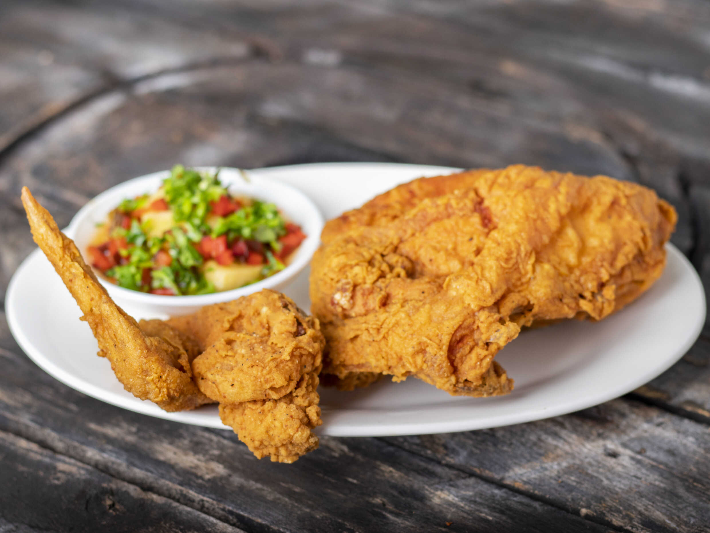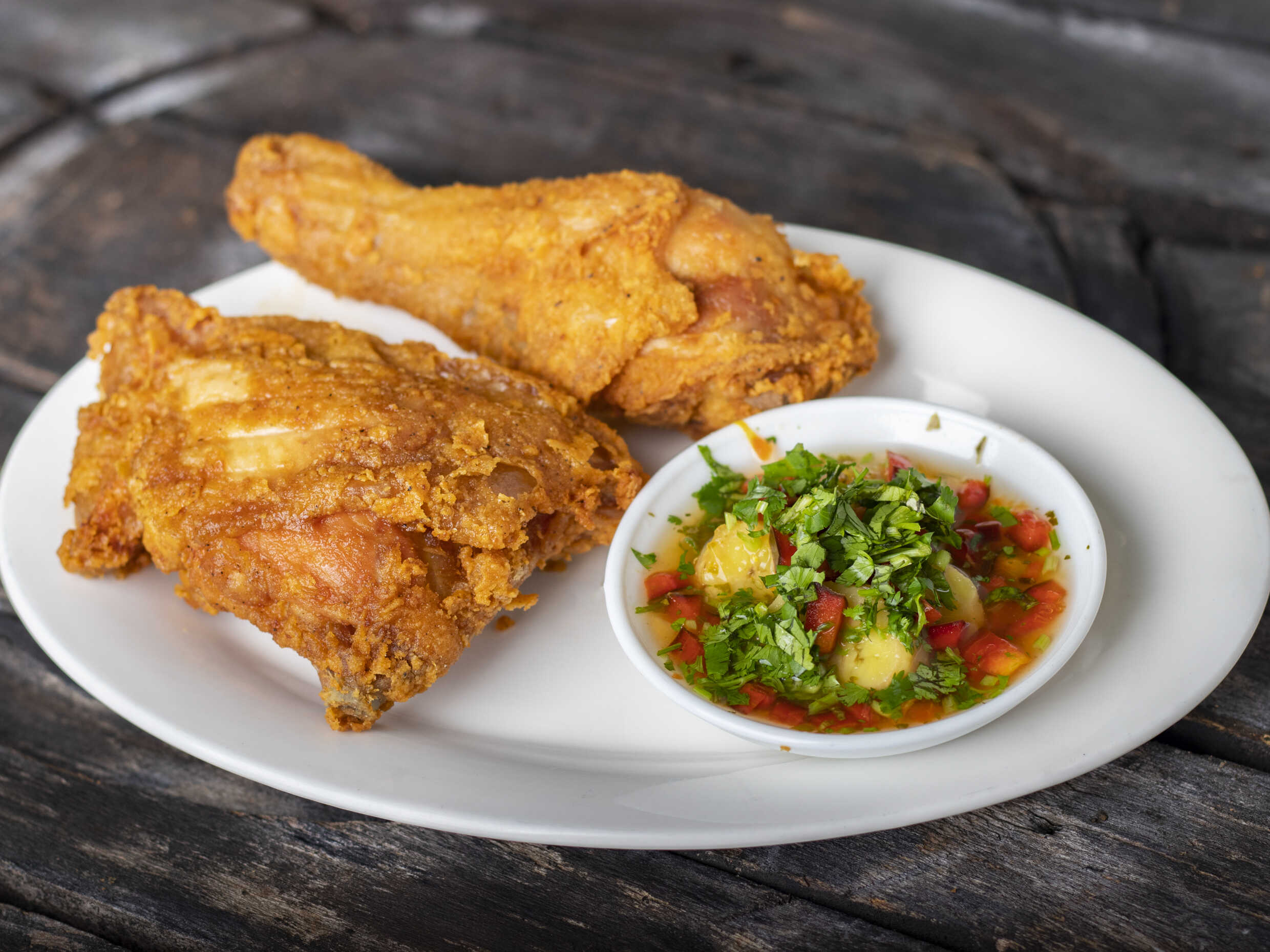 Pollo frito empanizado acompañado de bananitos o tortillas