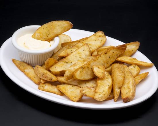 Deliciosos gajos de papa condimentadas con especies que dan un toque crispy acompañadas con natilla.