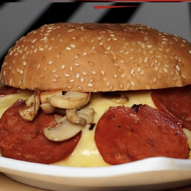 Nuestra pizzaburguesa lleva 1 torta 1/4 libra de res en la plancha, bañada en salsa pizza, hongos, pepperoni, queso mozzarella y queso parmesano, sabor único.