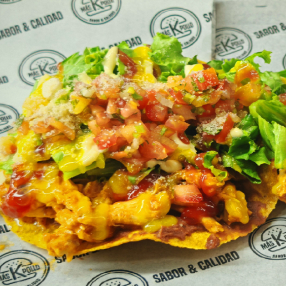 Tortillas de nachos con deliciosa carne de pollo mechada, queso cheddar derretido, natilla, salsa de tomate, ensalada de lechuga, pico de gallo y papas fritas.