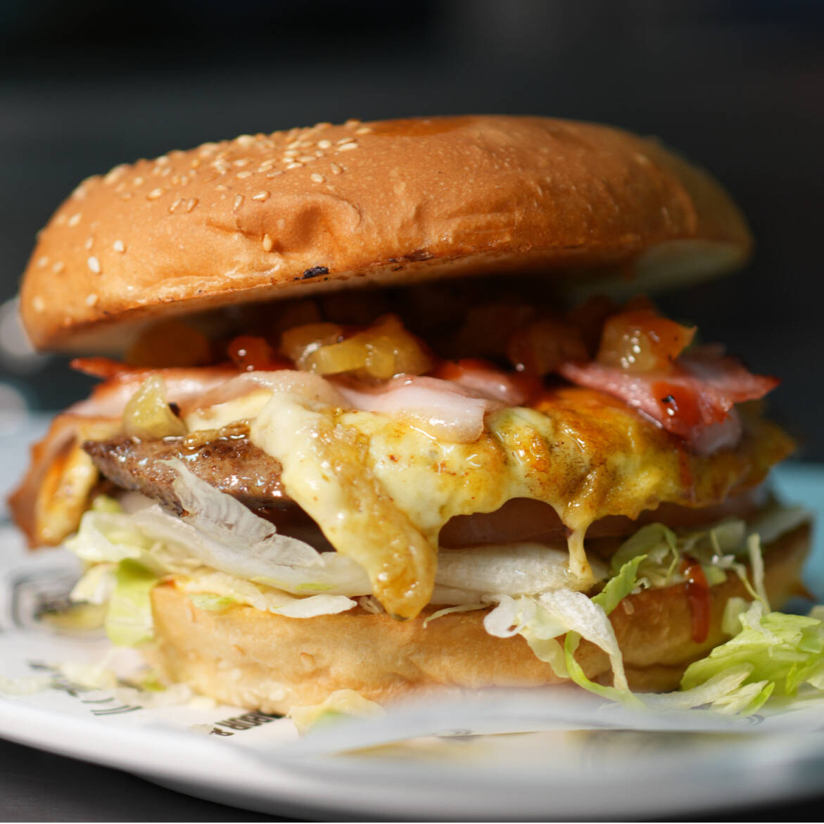 Nuestra hamburguesa lleva una torta de 1/4 de libra de res a la plancha, preparada con vegetales frescos, frijoles molidos, queso amarillo, jamón, doraditas, salsas dela casa, pepinillos con nuestro pan con ajonjolí y un toque de chile picante.