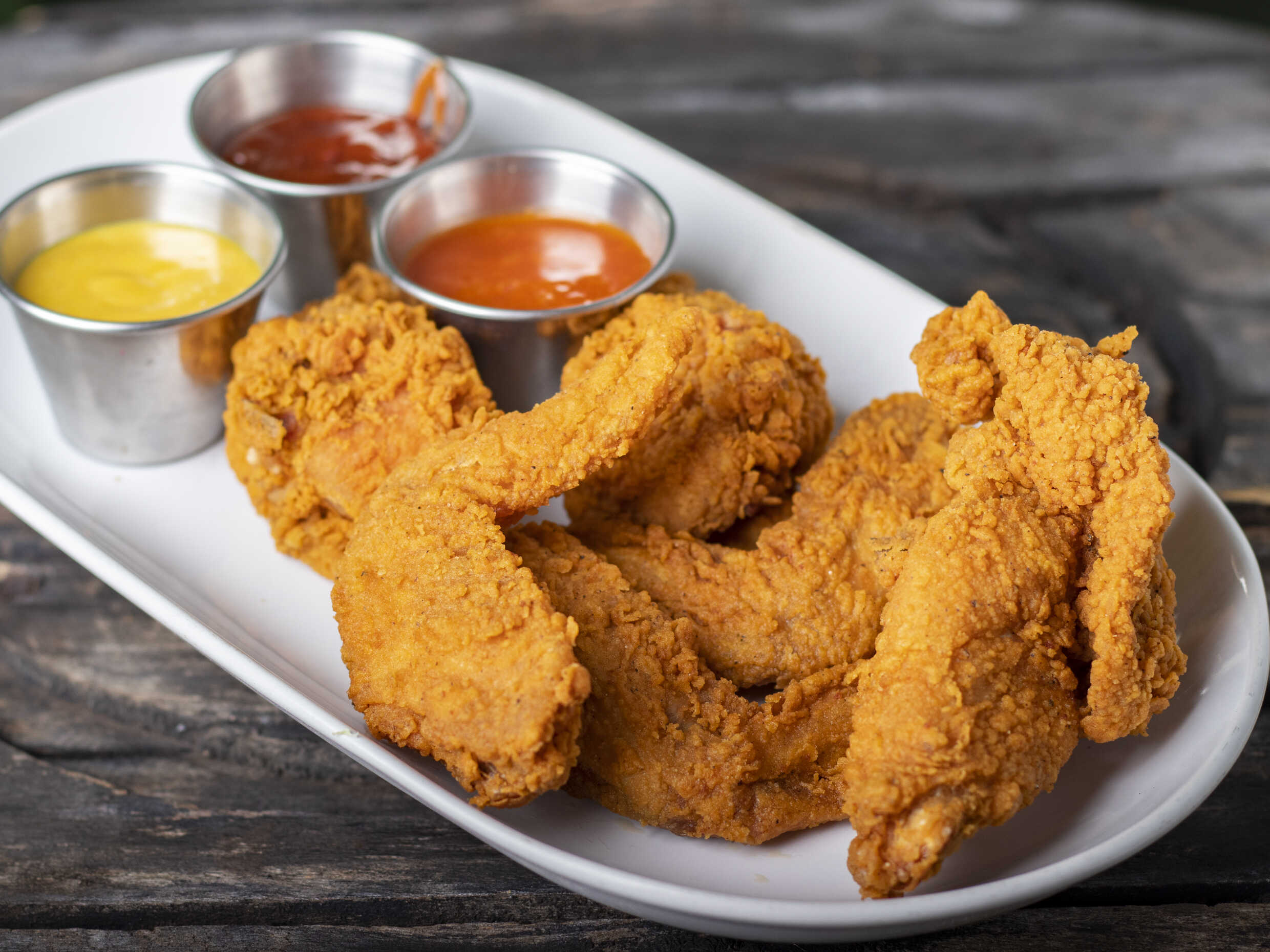 Deliciosos trozos de pollo empanizados listos para ser acompañados por tu salsa preferida.