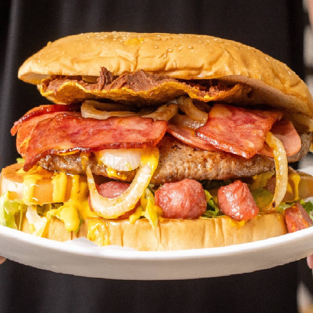 Torta de 1/2 libra de carne de res a la plancha, con rodajas de tomate, lechuga, frijoles molidos, tortillas fritas, salchichas, jamón, pepinillo, rodajas de cebolla, mayonesa, salsa de queso cheddar, tocineta.