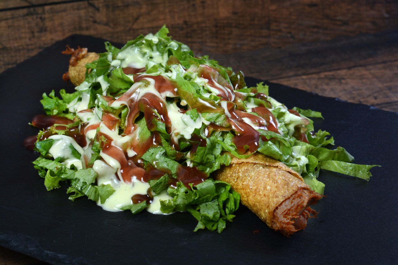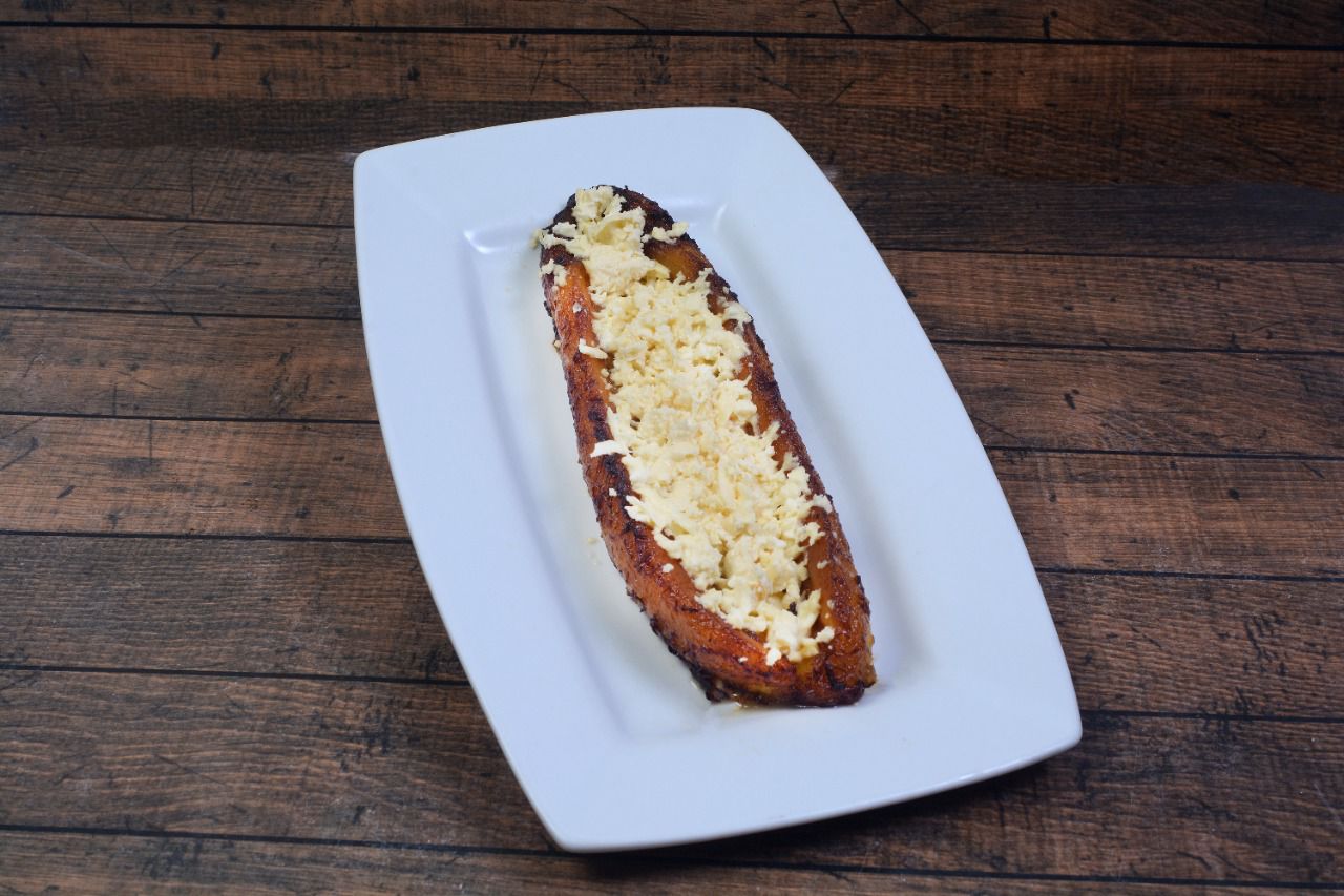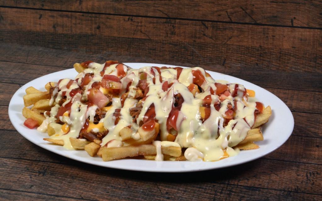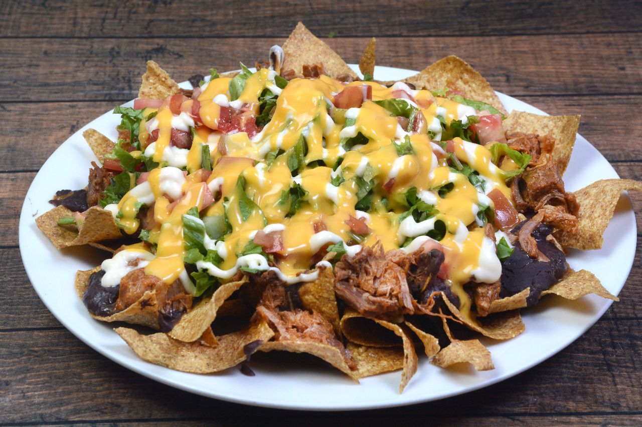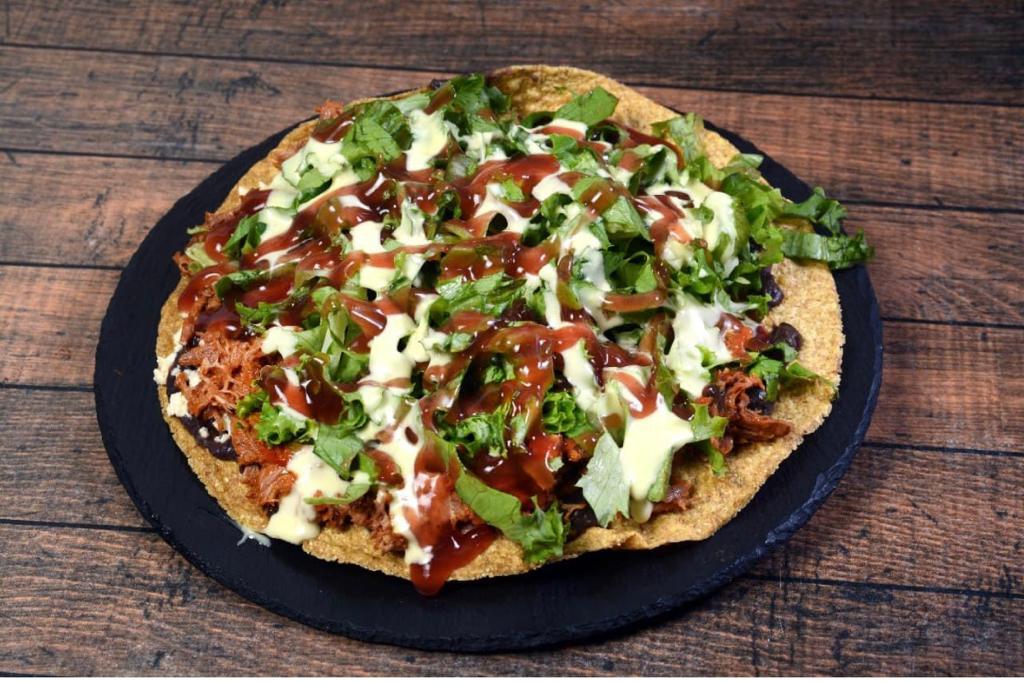 Frijoles molidos, carne mechada, lechuga, salsa de queso, pico de gallo y natilla.
