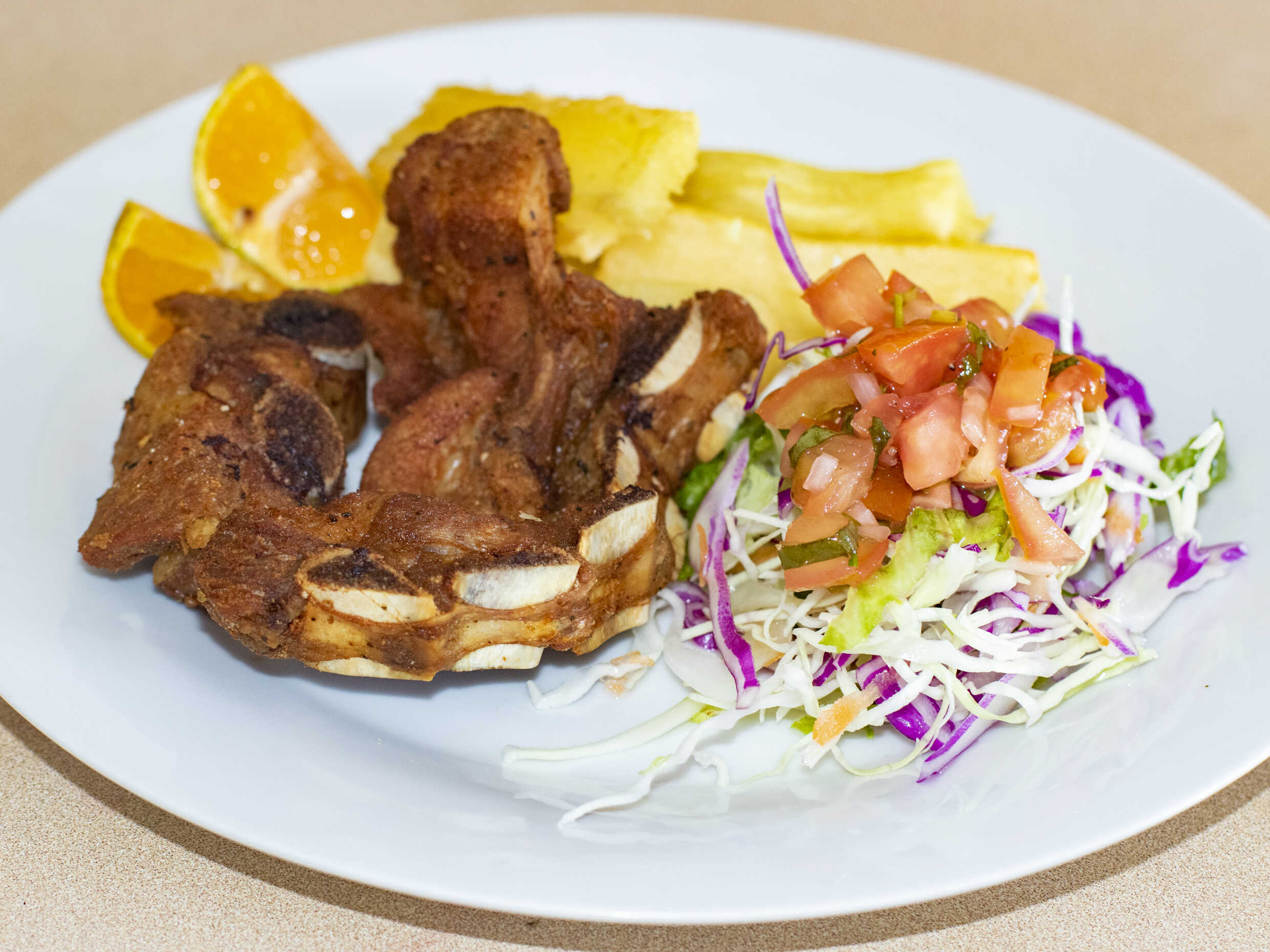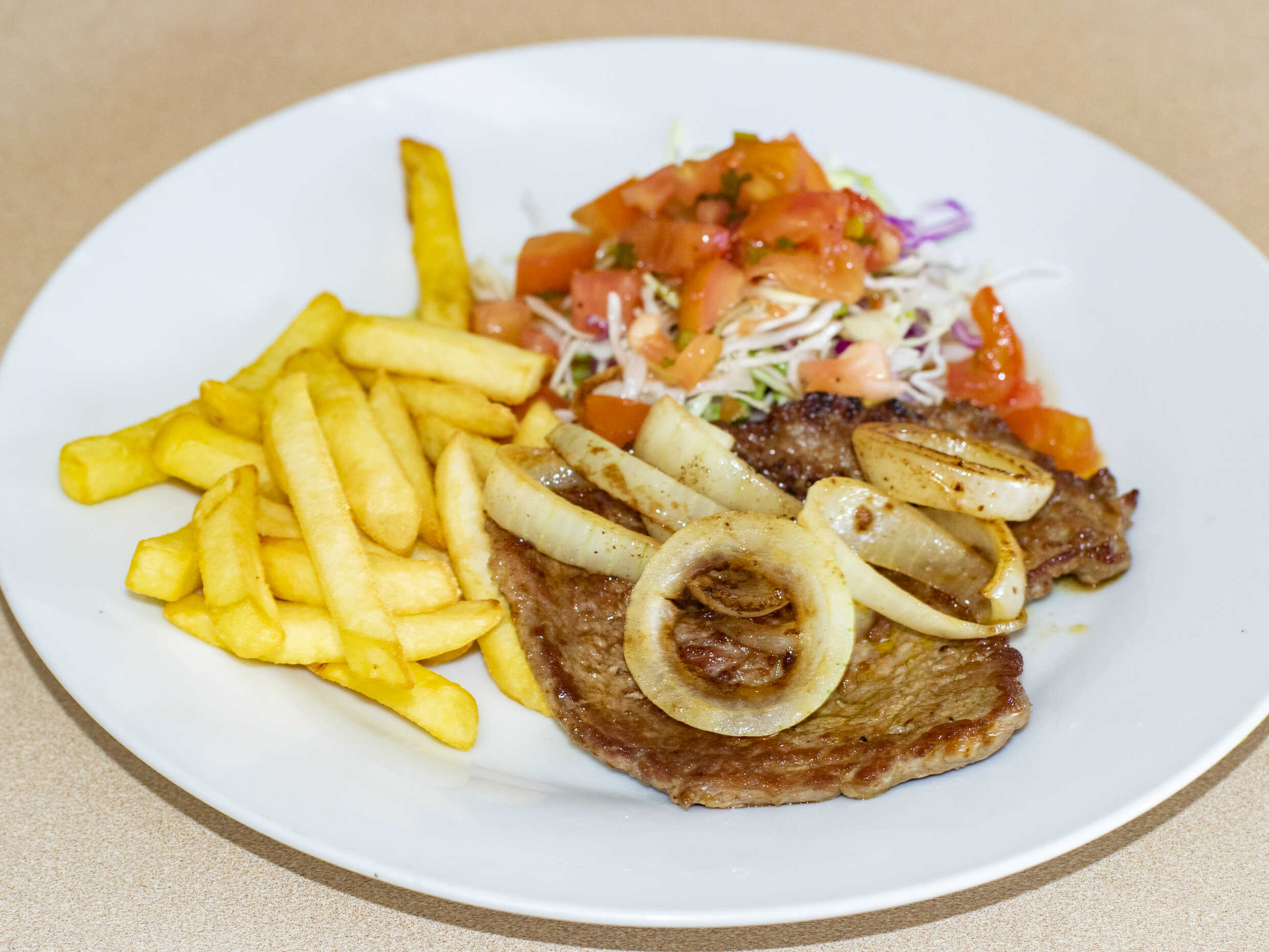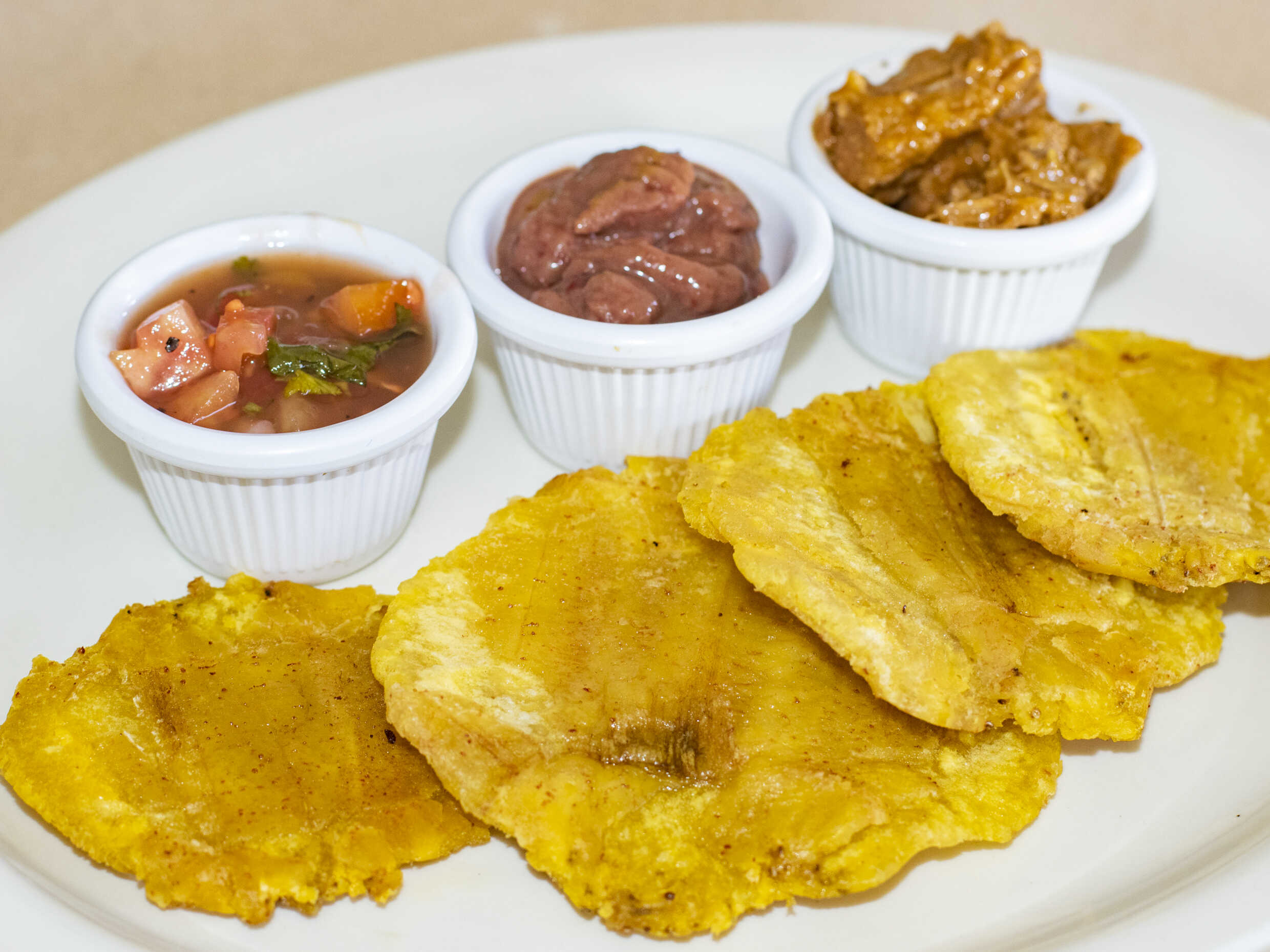 Carne mechada, frijoles molidos, ensalada, pico de gallo y salsas.