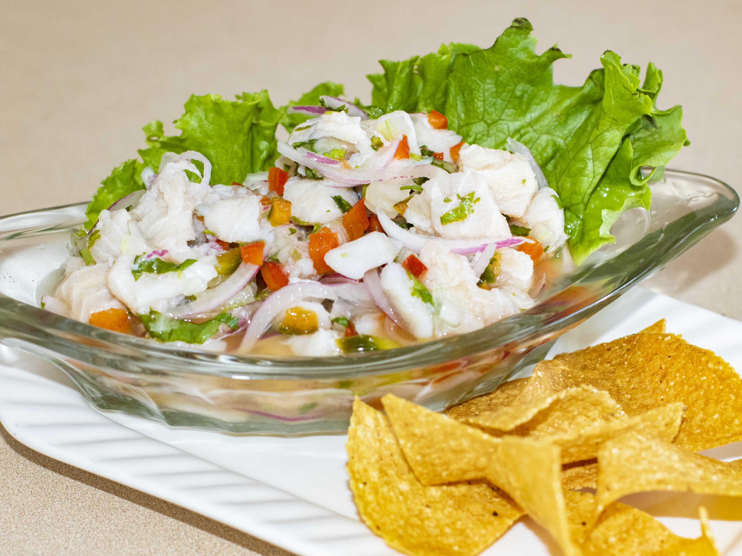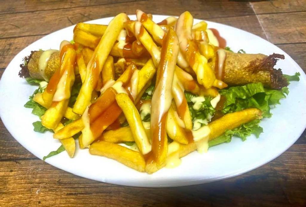 Frijoles molidos, pollo, carne mechada, lechuga, salsa de queso, pico de gallo y natilla.