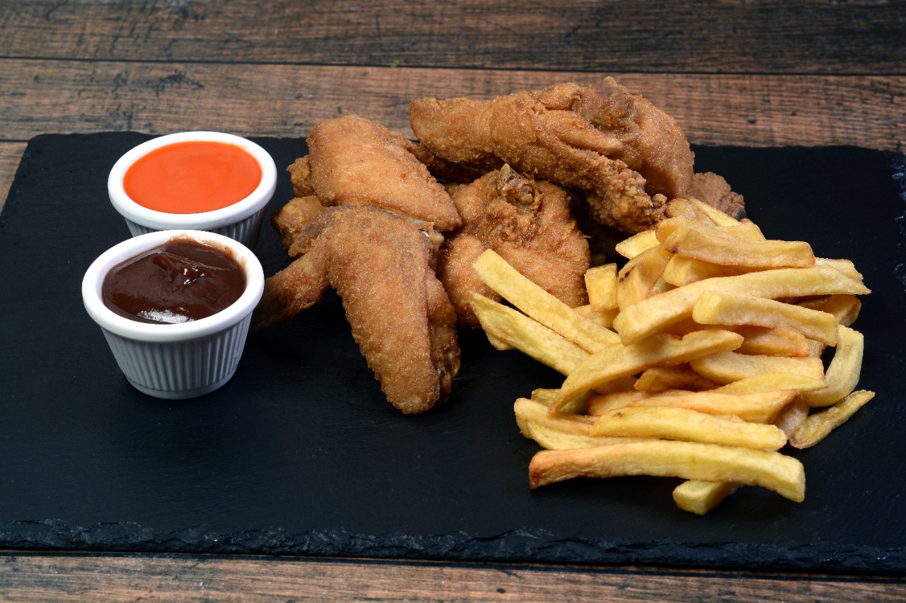 Frijoles molidos, pollo, lechuga, salsa de queso, pico de gallo y natilla.