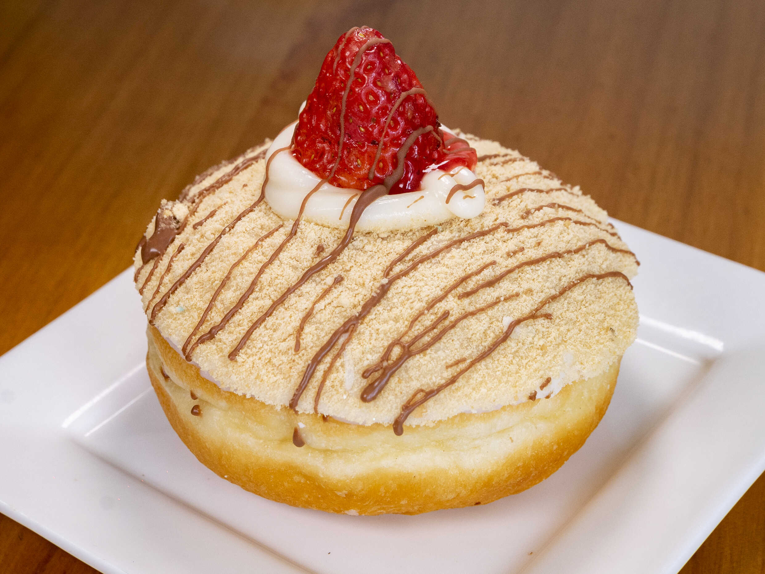 Deliciosa rosquilla, glaseada, con galletas, cheesecake, jalea de fresa y fresas naturales, preparada al momento. Una experiencia increíble de sabores.