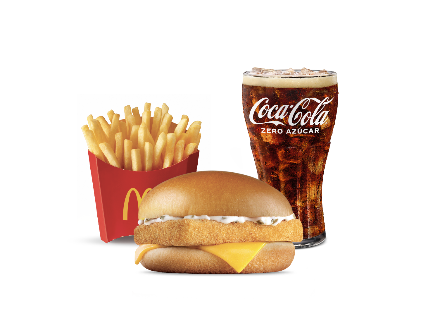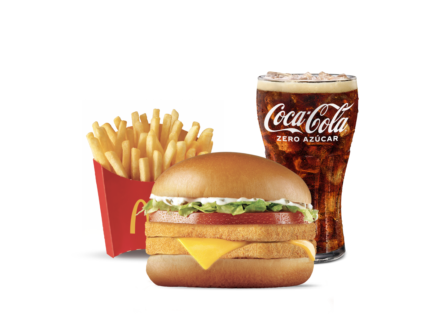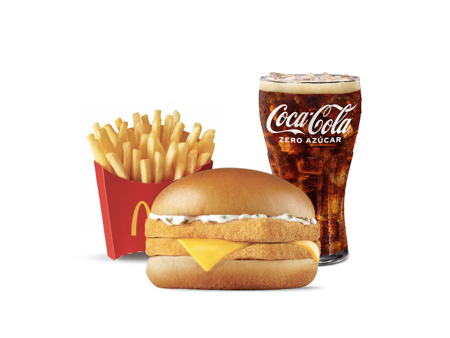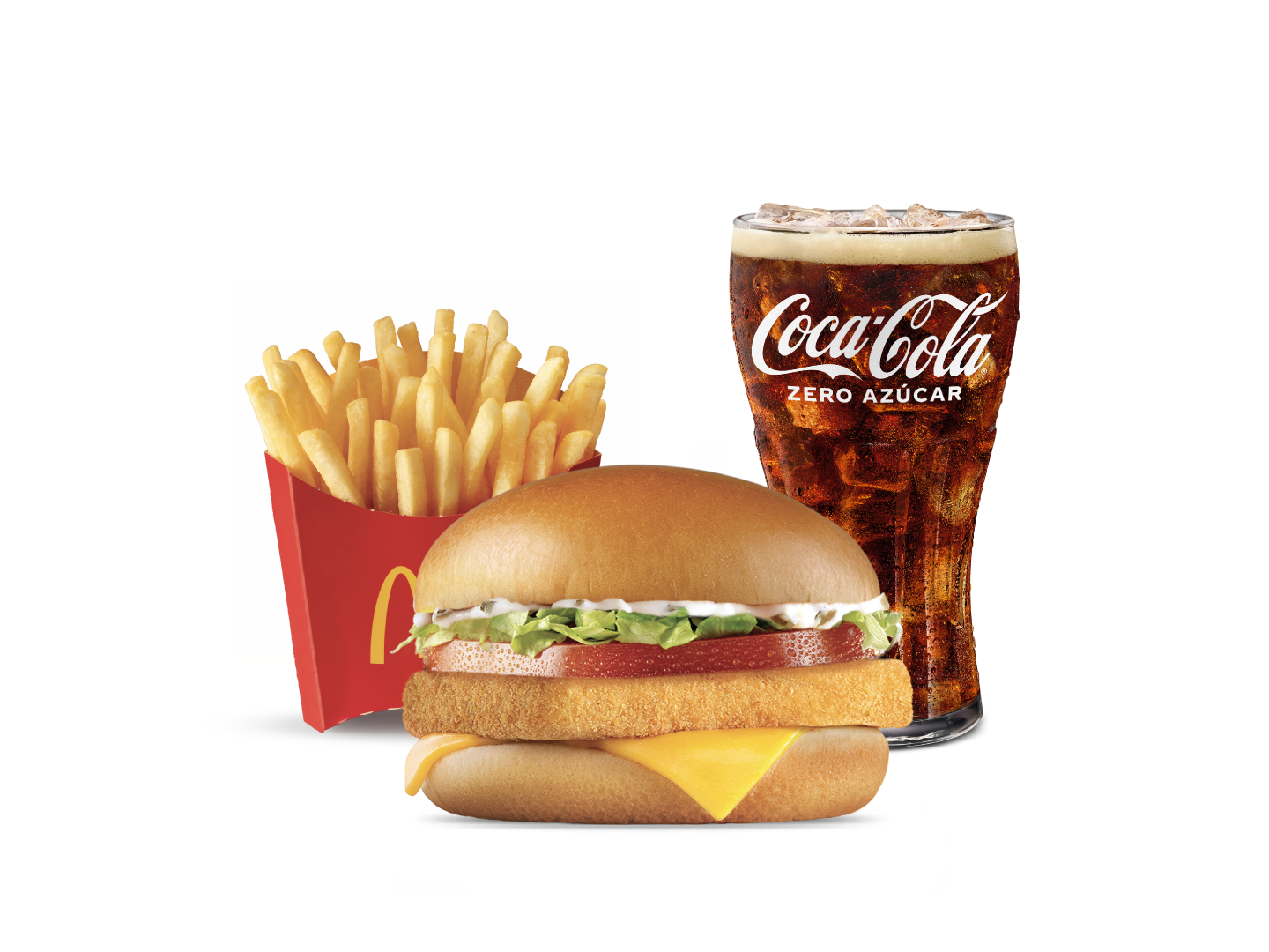 Hamburguesa de pescado con salsa tártara y queso amarillo. Con Acompañamiento Mediano y Bebida Mediana a elegir.