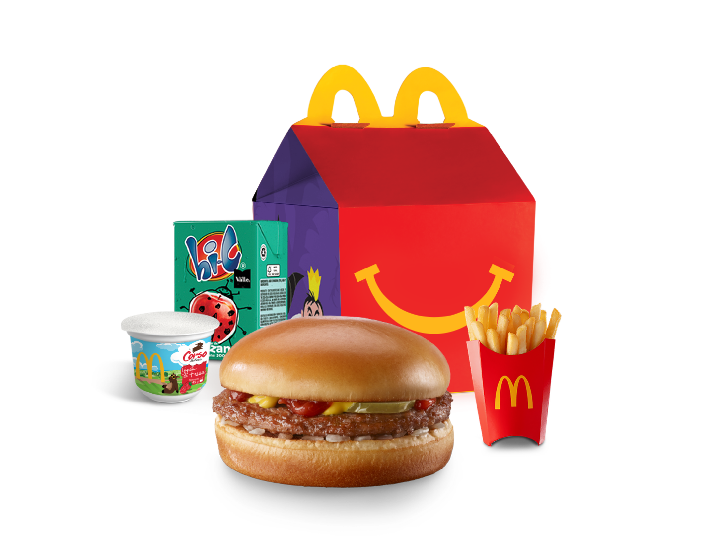 Cajita Feliz con Hamburguesa, papas kids, yogurt de fresa y néctar de manzana.